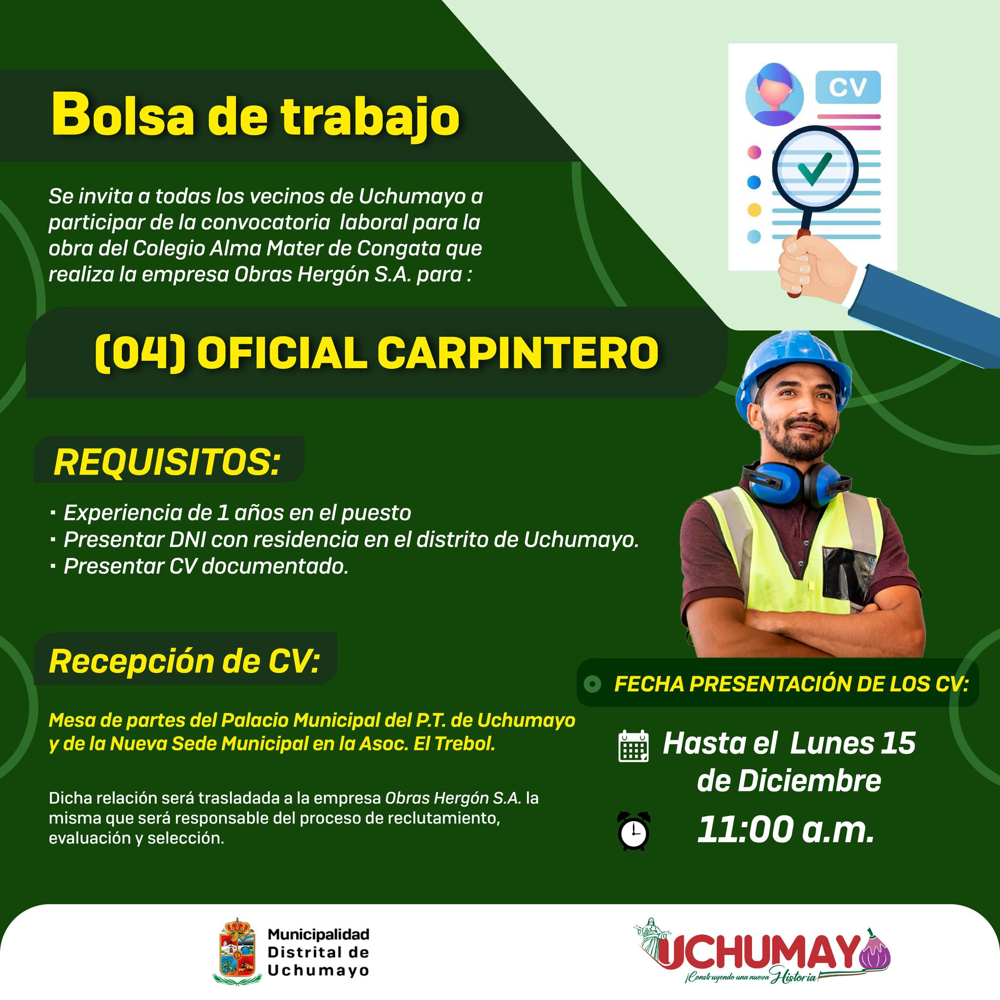 Se invita a todas las personas del distrito a participar en la convocatoria laboral de la empresa Obras Hergón S.A. para :