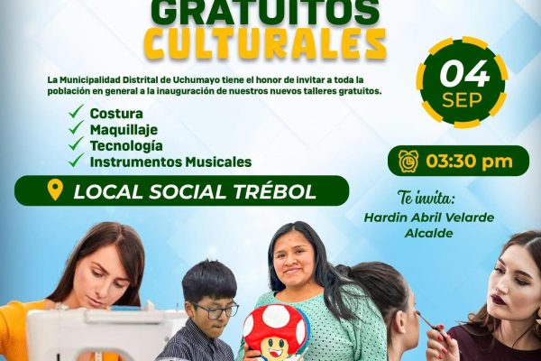 #TalleresGratuitos || La Municipalidad Distrital de Uchumayo invita cordialmente a toda nuestra comunidad a la inauguración de los Talleres Culturales Gratuitos. Miércoles, 04 de Septiembre Local Social Trébol A partir de las 3:30 p.m. ¡No te pierdas esta oportunidad de aprender y disfrutar con nosotros!