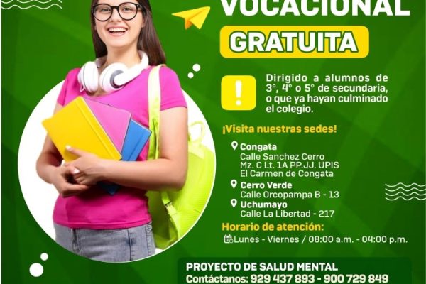 La Municipalidad Distrital de Uchumayo te ofrece orientación vocacional gratuita en todo el distrito. ¡Descubre tus oportunidades y planifica tu futuro! Visítanos Cerro Verde Calle Orcopampa B -13 Congata Calle Sánchez Cerro Mz. C – Lt. 1A / PP.JJ UPIS El Carmen de Congata P.T. Uchumayo Calle La Libertad – 217 ¡Agenda tu cita ahora!…